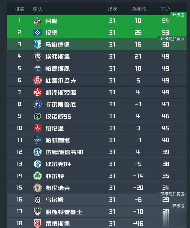 德乙的升级规则是,前2名赢得平直升级限额,第3名则需要和德甲第16献艺附加赛的对决;算作德国北部历史最为成功的球队之一,汉堡队史曾6次夺得德甲冠军,3次德国杯冠军,1次欧冠冠军和1次优厚者杯冠军;一度保持着德甲不左迁的记载。